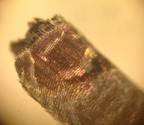 At first I didn’t recognize it because it was so dark, and the usual grey wrinkled bars were barely perceptible. But under a microscope it has the distinctive brown ocellus, vaguely purpled, strongly edged by golden coppery arcs, and the dark tornus streak wrapped about its inner margin.