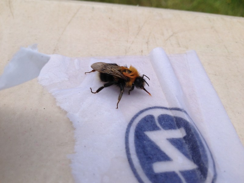 First aid for a tired bee; Bombus hypnorum takes a sip of sugar water,