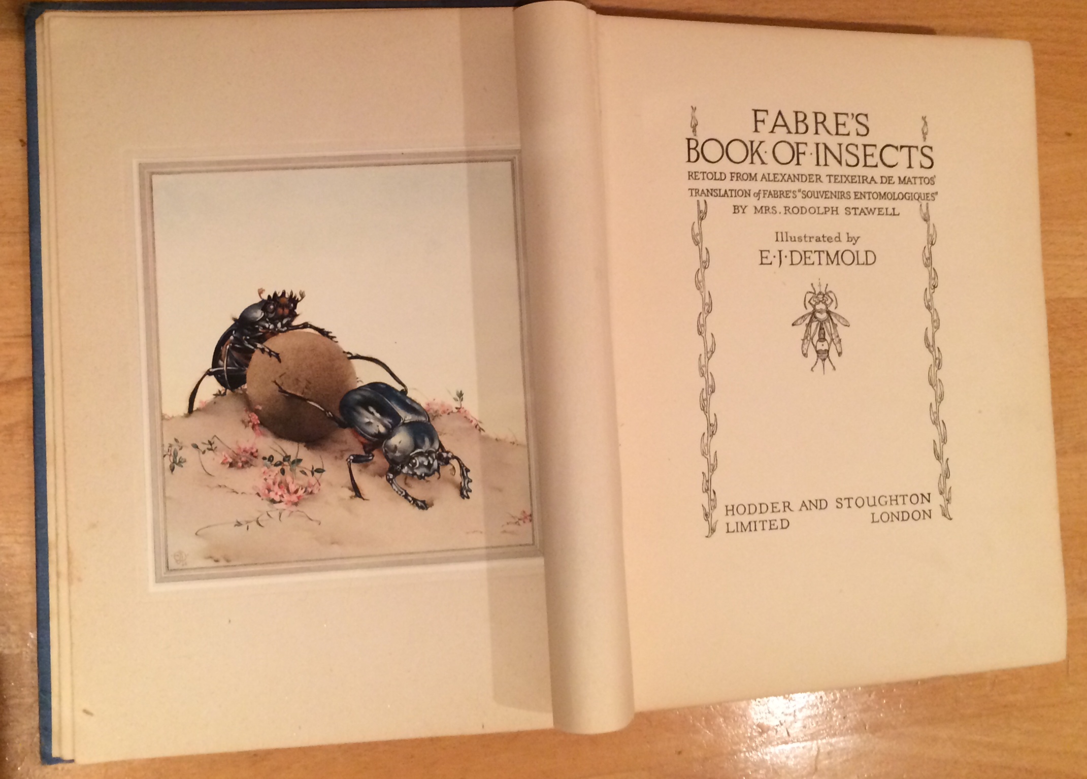 One evening last week the door bell went, and there on the doorstep was one of my old Ivydale students (now in year 8) and her mum. They’d picked up a vintage bug book from a market stall and wanted to give it to me as a present. It’s the 1938 Detmold-illustrated edition of Fabre’s Book of Insects. What a delight.