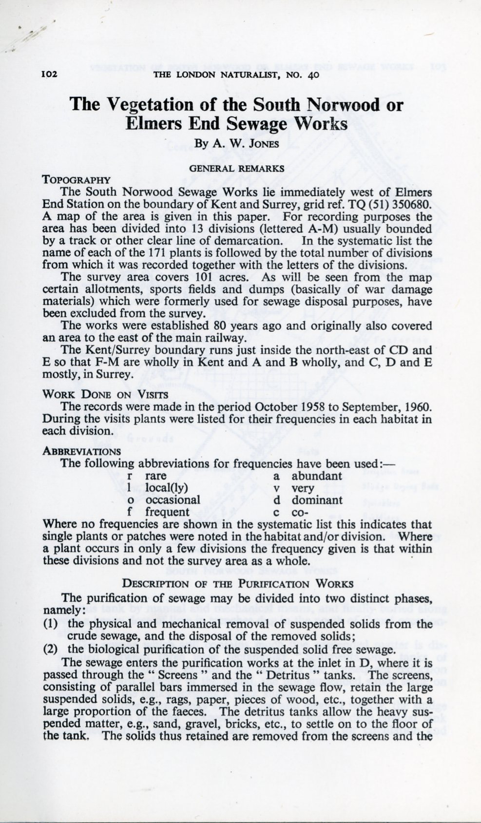 Dad always had a wildly eclectic taste in books, but even these peculiar volumes had a use for him. He had them for his own background research when making a list of the plants from the South Norwood Sewage Works, half a century ago. We lived in South Norwood at the time, and this was one of the nearest green open spaces. Although there were the usual concrete sedimentation tanks and circular filtration beds in one corner, much of the site was used as field irrigation for the final purification, where the sludge was dumped and the water was pumped until it finally trickled away back into the Chaffinch Brook, and ultimately into the River Thames at Deptford. Every so often, on a rotation system, the dried sludge on the surface was ploughed into the soil. This made for a series of fields in various stages of marshy dampness and recently ploughed disturbed areas. This was not a public access site, there were no leisure grass areas or playing fields, no ornamental planting was done; instead the sewage works represented a strange semi-natural wildlife reserve. I know all this because Dad published the results in the journal of the London Natural History Society — The London Naturalist — in 1961.