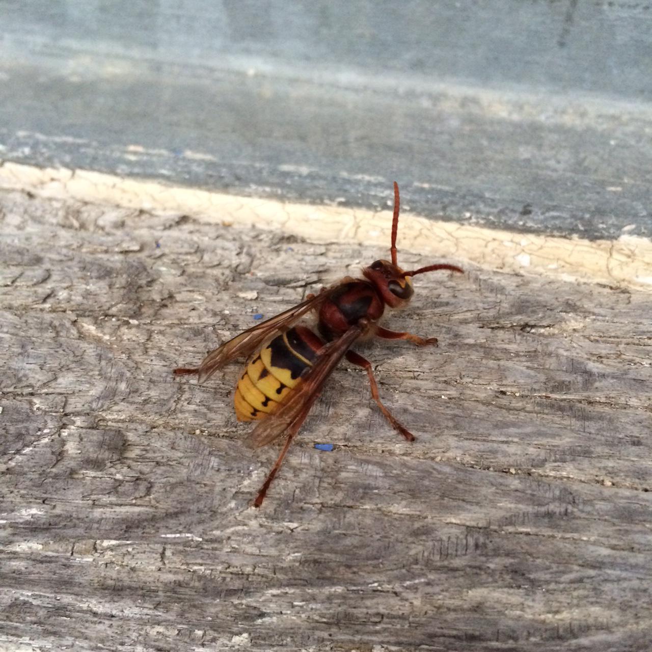 So I am mightily relieved, later, when It transpired that the well-worn wooden threshold to the upstairs doorway is perfect hornet nest material and she (or maybe several different shes) has simply taken a wrong turning into the bedroom after a chewing session, and become disoriented by the skylight. We’ll probably be seeing her again, but this time we’ll know what she’s after.