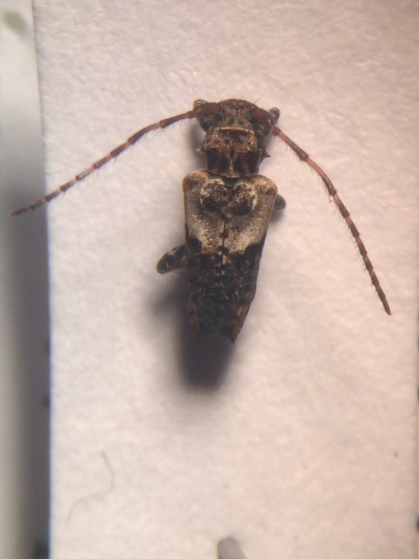Pogonochaerus hispidus, a small (4.5mm) longhorn, beautifully camouflaged on a lichen-coloured tree trunk. Distinguished by the small spines at the tip of the wing-cases and the all-black scutellum. Not easily visible in the field, even with a hand lens.