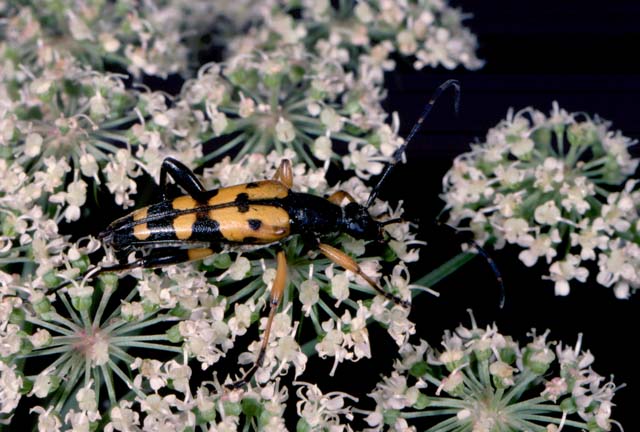 The wasp longhorn, Rutpela (Strangalia) maculata is a frequent flower visitor.