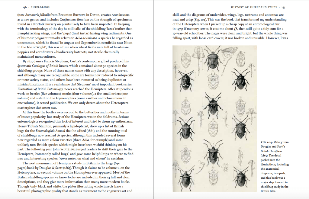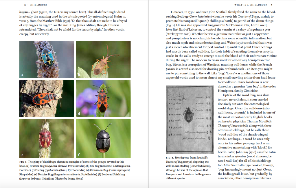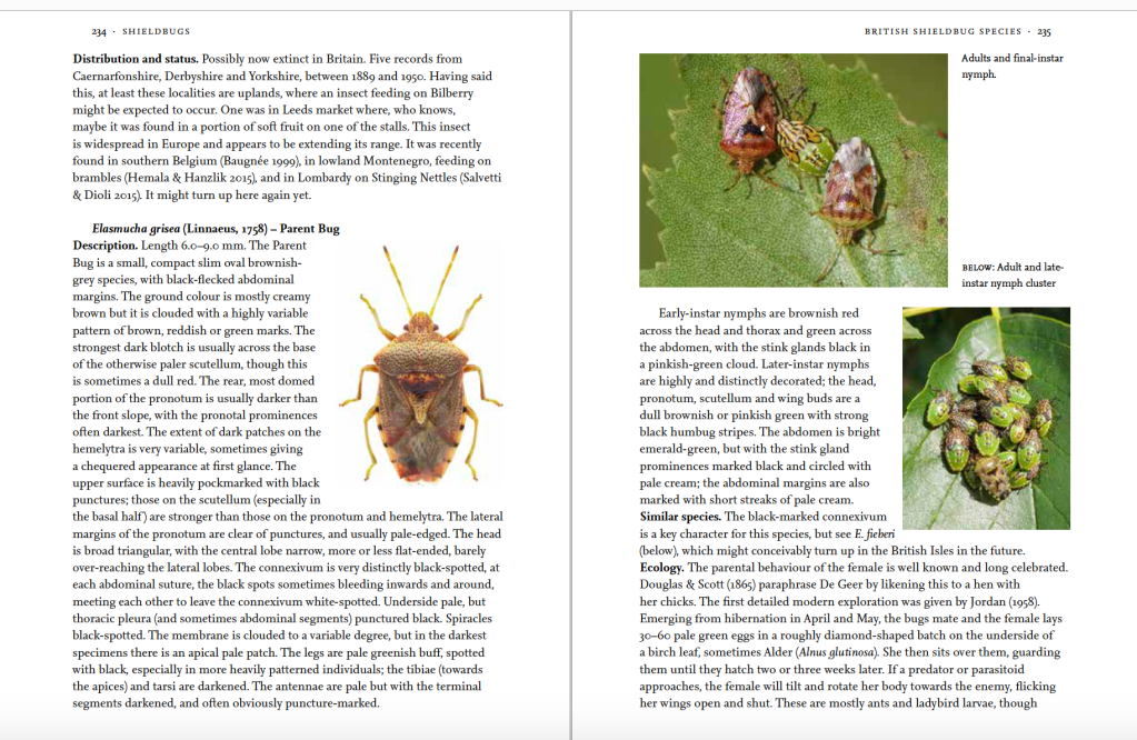 So it is that I have just about finished the New Naturalist volume on shieldbugs. With only about 80 species in the British Isles and most of them easily identifiable on sight, or from a photograph, I’d rarely had cause to examine them closely until now; I’d normally just note the species names in the field notebook and move on. But shieldbugs are lovely. Why else would we give them such an elegant heroic heraldic name? Sure enough, they are glossy, chunky, often large and brightly coloured, and suitably shield-shaped. Shieldbugs have a regal and aristocratic air about them. My stylish pentatomid-design enamel lapel badge often draws comments because its obvious shield shape looks as if it could be the emblem of some noble family. It is, of course, but not necessarily in the way most people imagine.