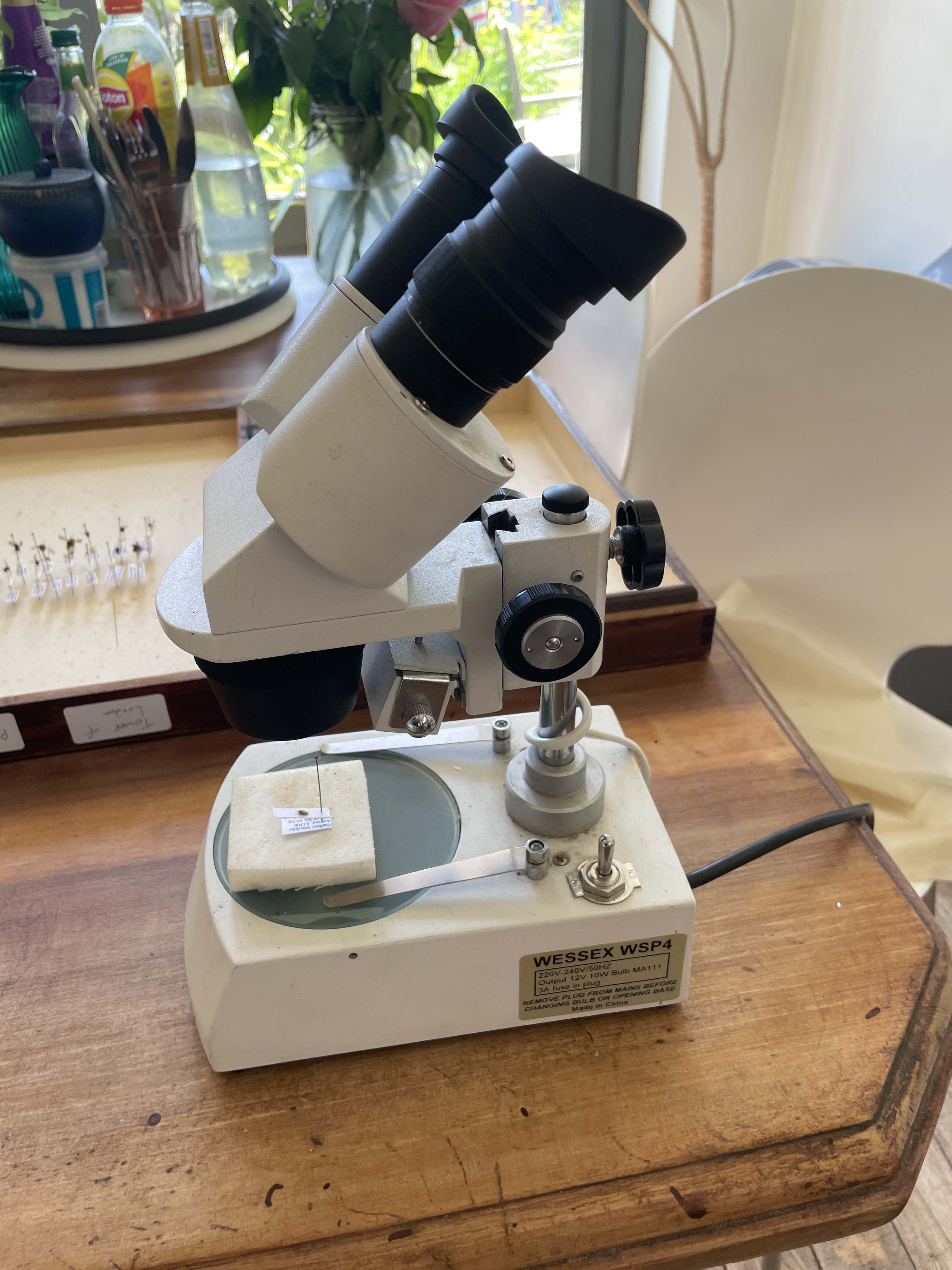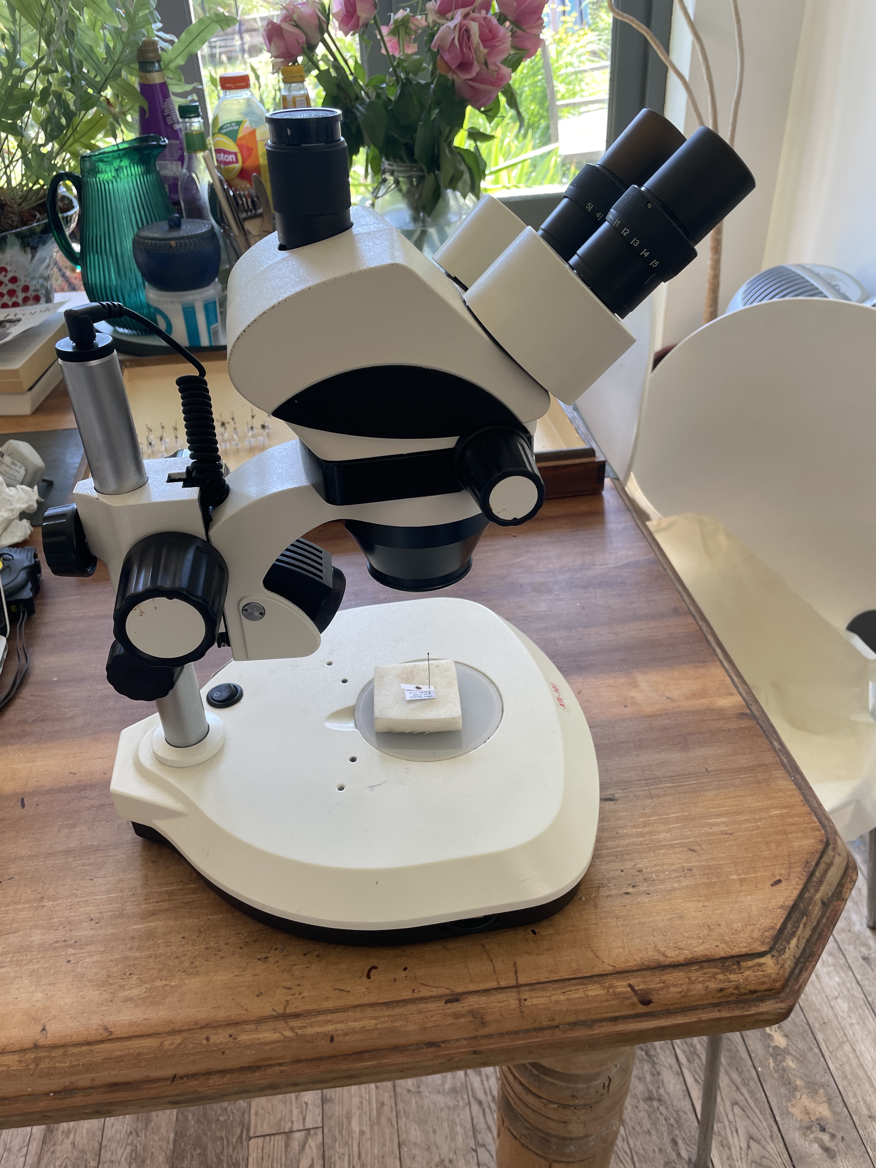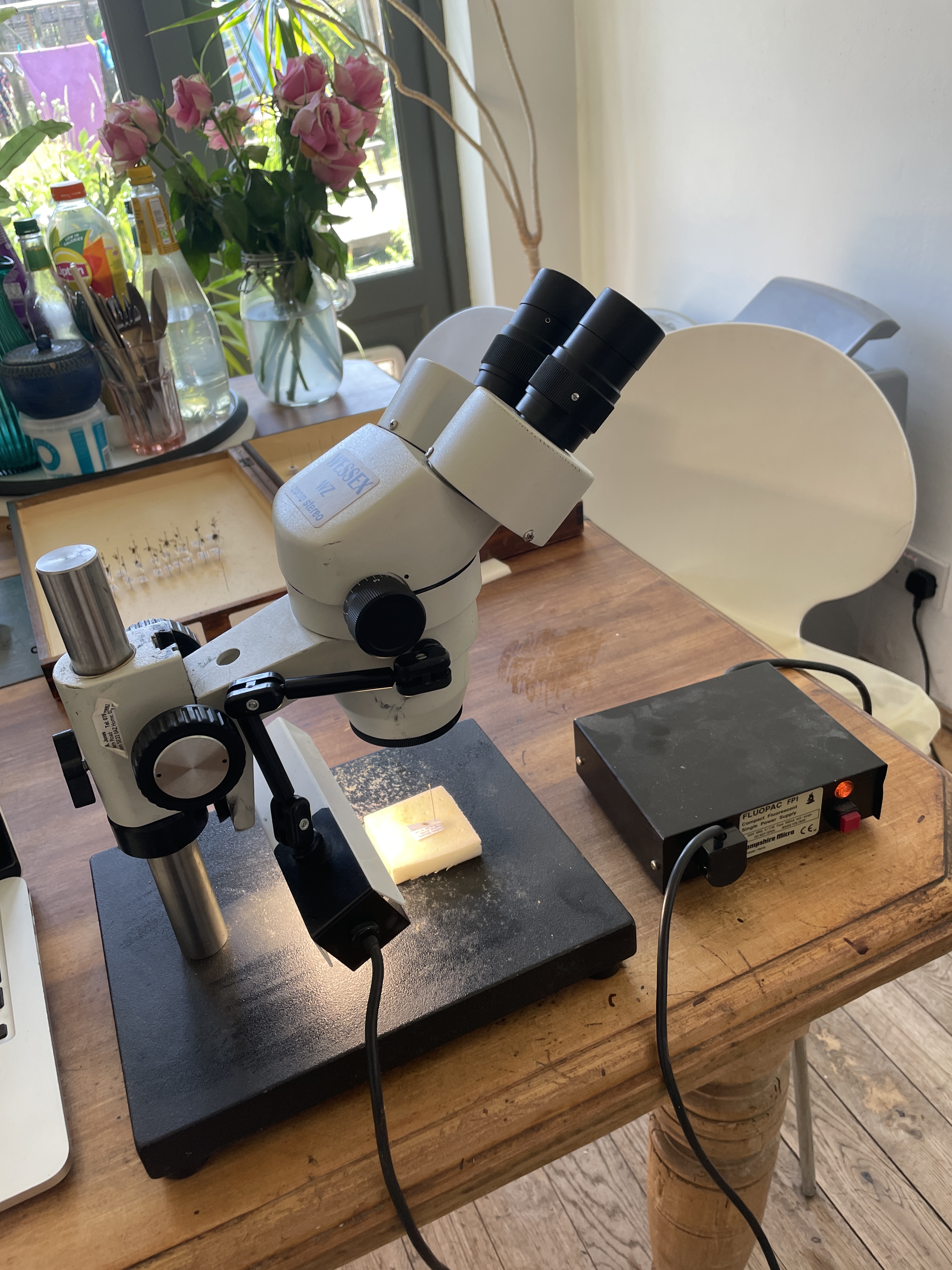 Wessex WZ zoom. x10 eyepieces, zoom x1 – x 4 giving x10 to x40 life size zoom. Built in flourescent light on angled adjustable arms powered by separate power supply box. Stands 37 cm high. Comes on very heavy solid metal base26cm x 20cm. £150
