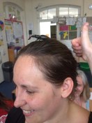 Miss Reeves shows off the largest head louse ever to find its way into the school.