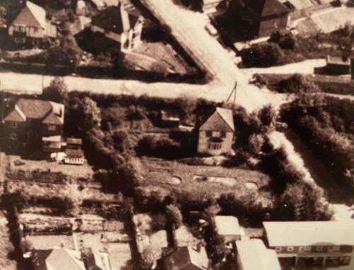 An aerial photo of the house in its original large corner plot. This can only have been taken a year or two before we moved in.